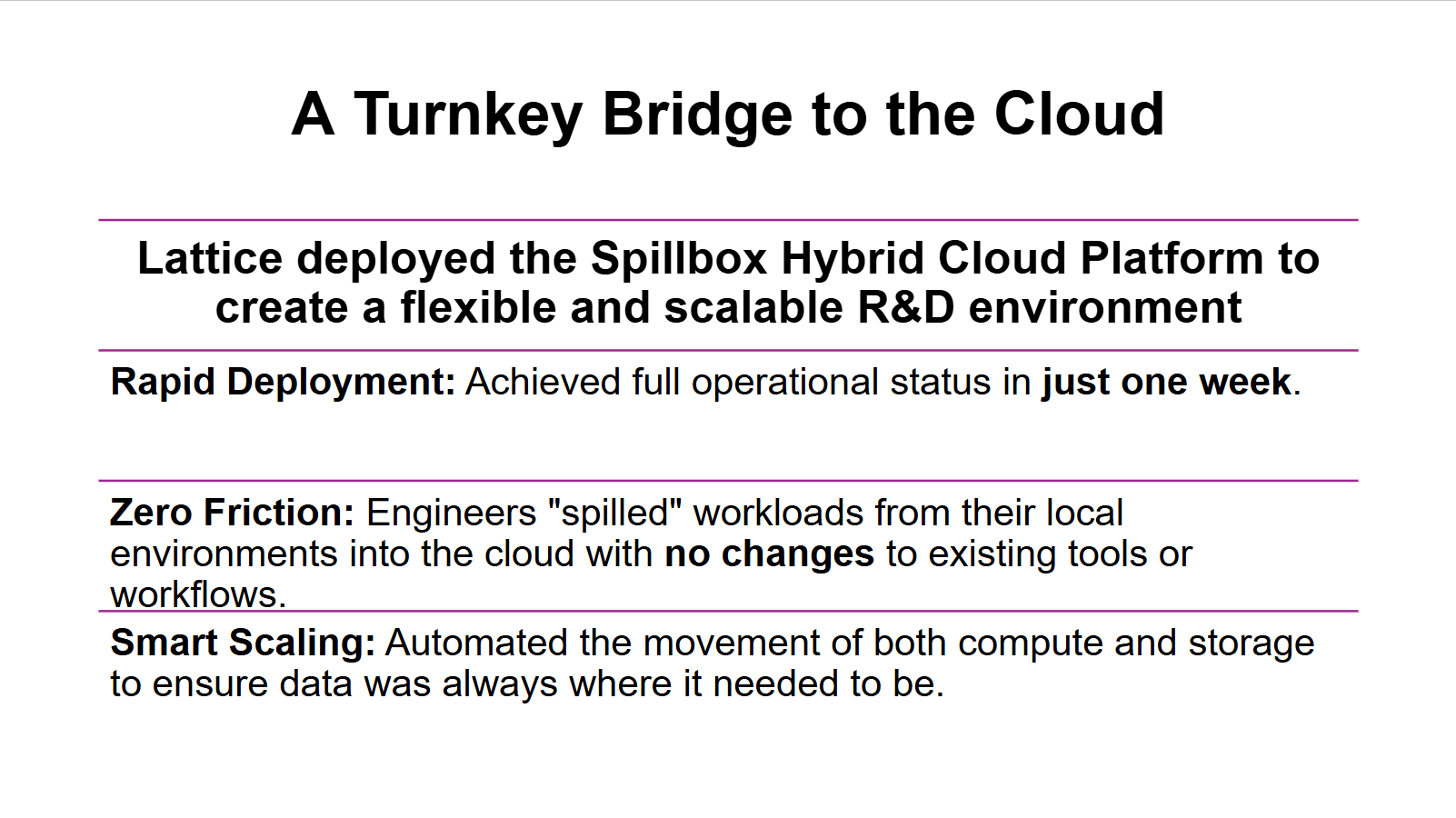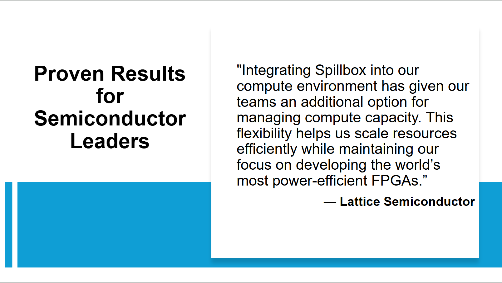 Cost-effective and flexible access to compute capacity is critical when designing complex solutions for the data center space. Working with Spillbox has enabled us to meet our dynamic compute demands to minimize schedule impact.